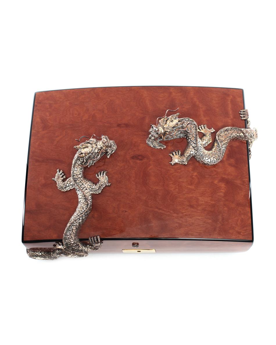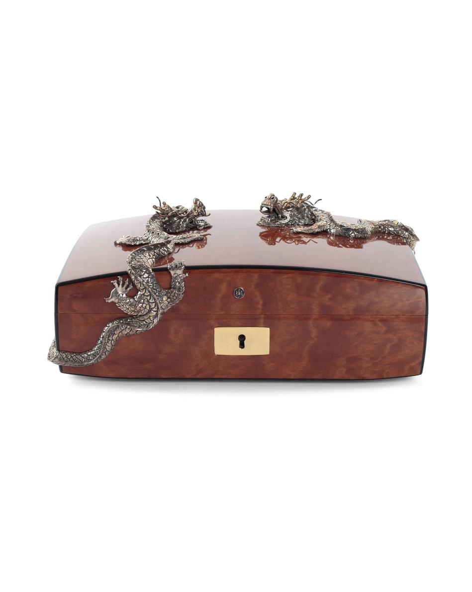 This exquisite humidor has been hand crafted from the finest cedar wood, using ancient Thai and Asian techniques. Faced with highly figured masur birch, it is beautifully finished with two intricately hand carved solid-silver dragons.