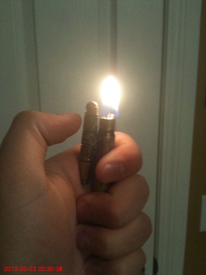 Lighter when lit (flame is adjustable by exposing the wick more for a bigger flame, or less for a smaller flame)