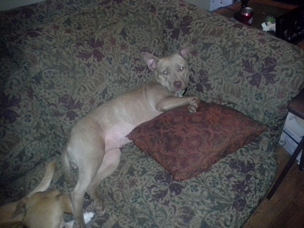 That's Molly. Got her last night from my friend and his GF who located this dog that was at a foster home. She seems pretty cool sofar. Energetic, but not totally batshit. Haven't noticed anything psycologically strange about her. Loves to play with her ball, and is a good retriever. Walks good on the leash, good with kids & other dogs, and people. Only thing is, the cat isn't happy. At all. Guess they'll have to learn to get along.
