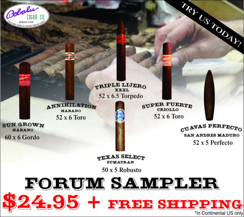 TRY US! You get 6 of my favorite cigars at a huge discount. We are so sure you will like them that we also shipping them for FREE! in Continental US only http://www.bobalu.com/fsfs.html
