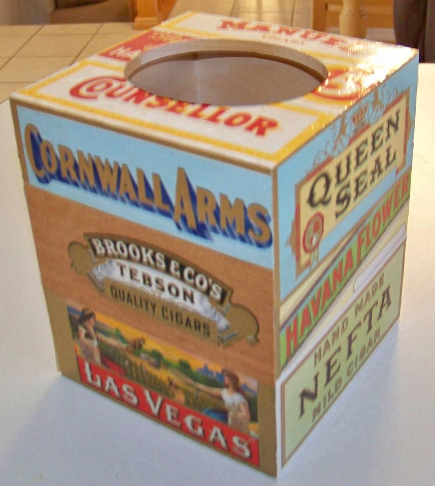 Wood Kleenex box cover done with old labels circa 1930-1960: