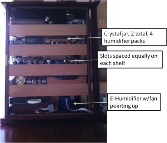 There are four shelves in the humidor, with gaps in each shelf. I placed the e-humidifier and fan on the bottom, pointing up through the gaps in each shelf.