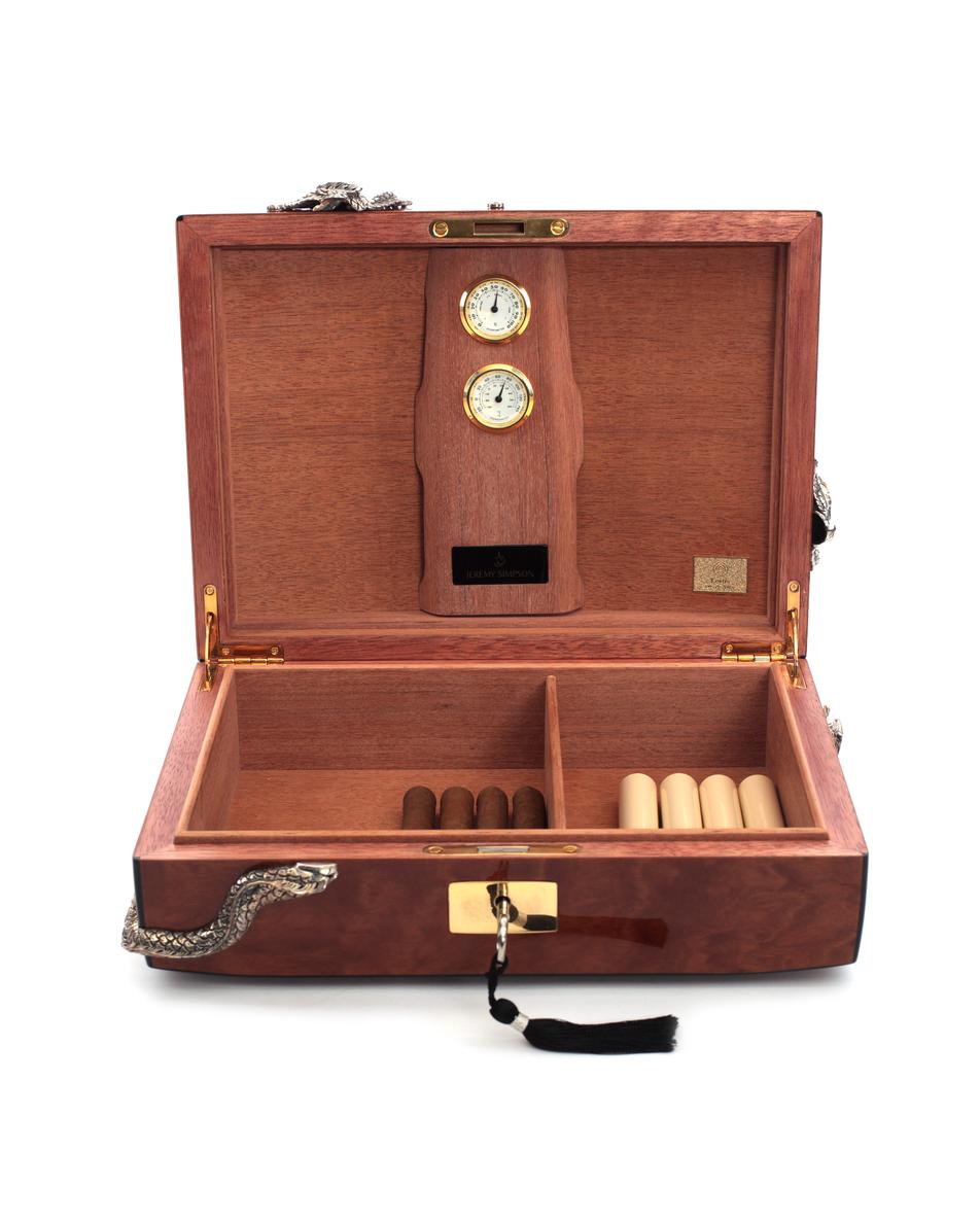 This exquisite humidor has been hand crafted from the finest cedar wood, using ancient Thai and Asian techniques. Faced with highly figured masur birch, it is beautifully finished with two intricately hand carved solid-silver dragons.