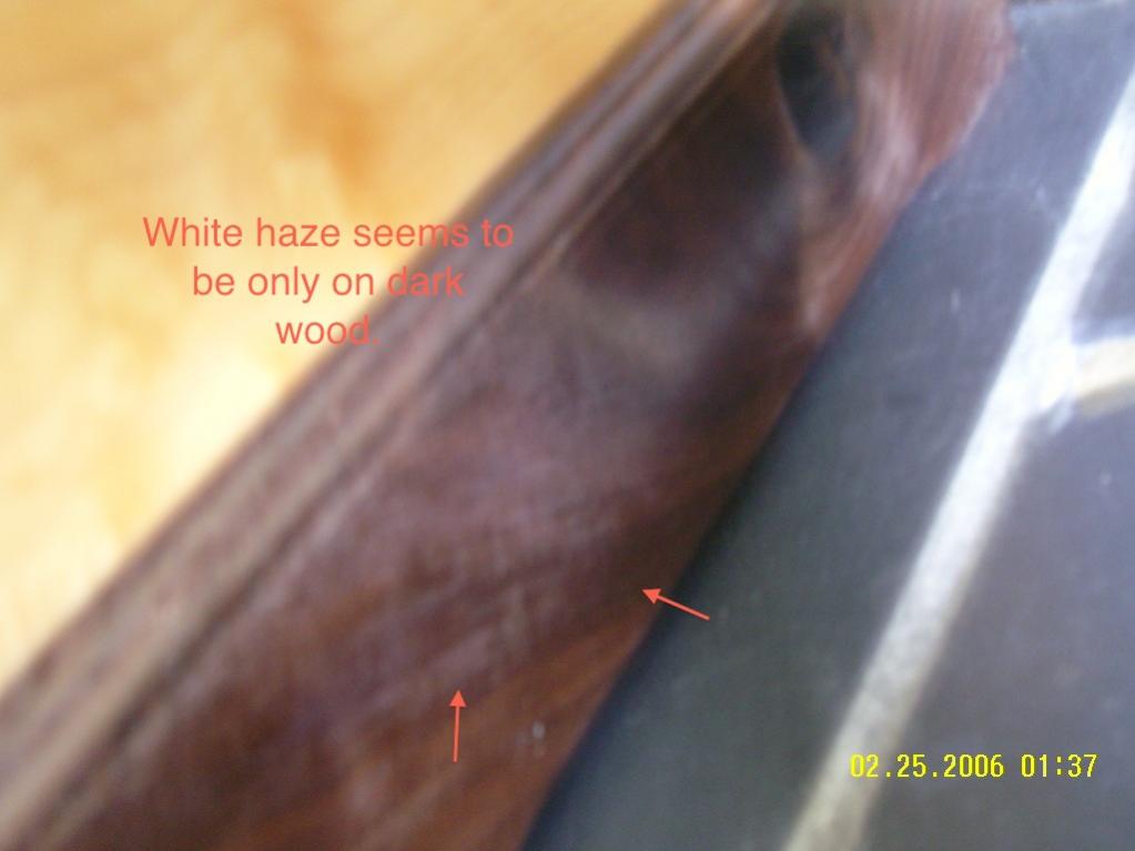 I believe the white haze to be dust that got in to the lacquer..... Not really a hard thing to fix.... that's what it looks like to me. I try to ensure that don't happen, but sometimes it gets pretty dusty in the shop.... and my eyes don't see straight....