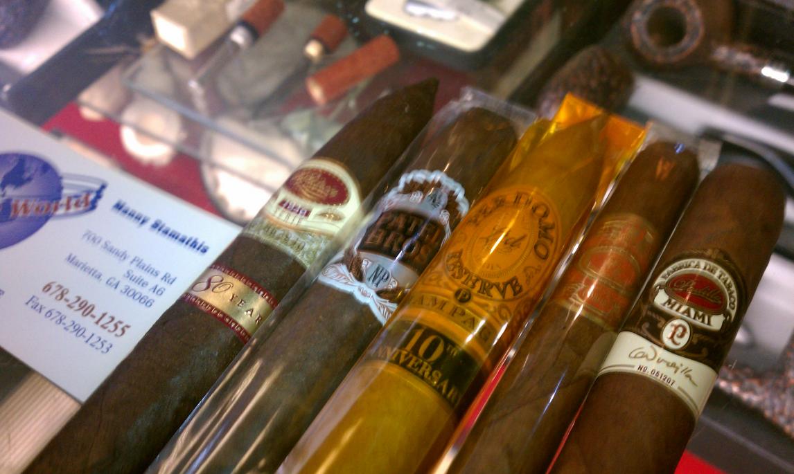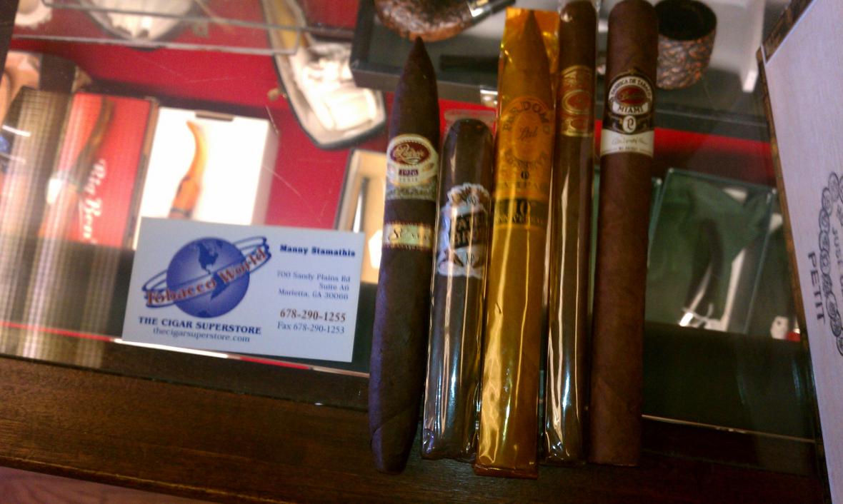 In this thread, post a picture of 5 cigars, side by side, on the counter of your local B&M.