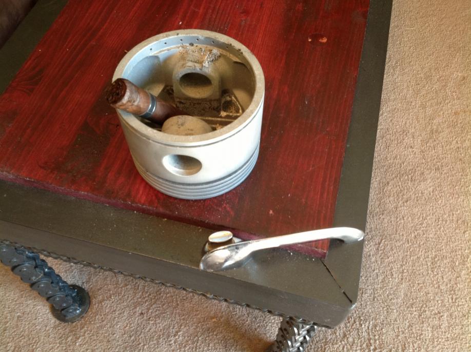 Nice looking piston-ashtray you got there, CC86! I think when I make mine, I will cut it through the pin holes. I think that will make for some nice cigar rests, I'm not worried too much about the depth, and capacity won't be a big issue, as long as it holds the ashes from one or two cigars. I'll post a pic when it's finished. Gotta find a nice big piston first though... Looking back now, after hearing your story about the Coupe DeVille, I wish I'd saved one from one of the few engines I've blown up! Ha!