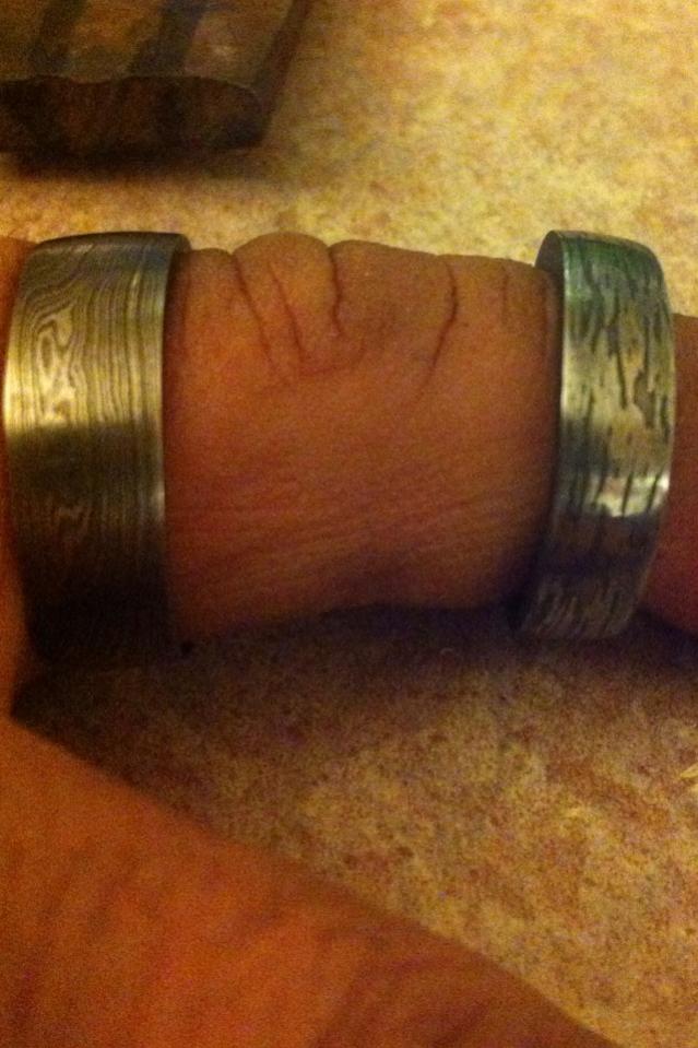 Over my vacation I had some time to forge out some rings for my daughter the one on the left is made from cable the other one is made from a billet of damascus it's around a 1000 layers. Got some much needed tongs completed also. Then started on a new grill set. Anybody else do any blacksmithing? I would love to see some other projects.