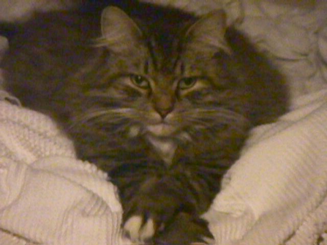 My ex-wife has "custody" of all of our cats, one is almost all grey and looks a lot like yours. She's 17 1/2 years old now and so is her sister. There are two other cats, a purebred British Short Hair (all black, ten years old on May 1st) and a purebred Maine Coon (all white, nine years old on January 12th). The Maine Coon actually looks quite a bit like my avatar photo but her eyes aren't as dark. I'll see if I can get some digital photos sometime......