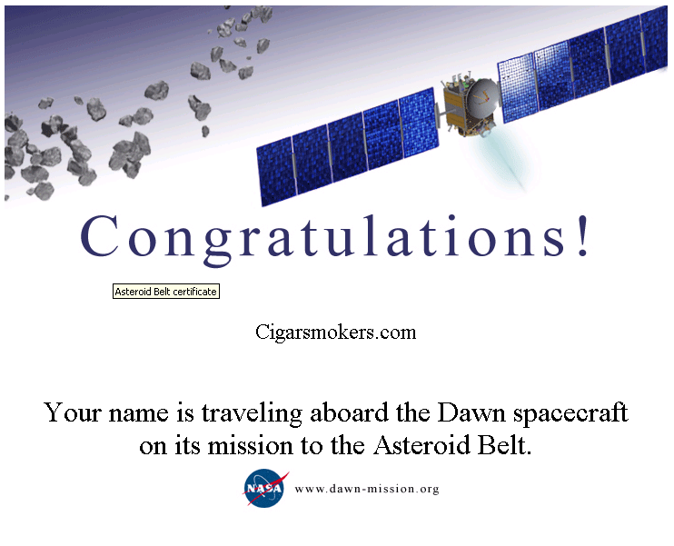 NASA’s Jet Propulsion Lab is sending an unmanned spacecraft to our solar systems asteroid belt and is allowing anyone to send a name along for the ride. I went ahead and made sure Cigarsmokers.com would be among the list of names making the trip!