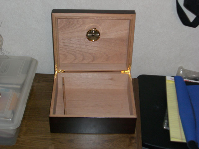 Here's a pic of the humi I just got, it's not much but it's a start. I got it with a cutter, 3-finger ash tray, and 2-finger leather travel case, it's the nebie starter kit from cheaphumidors.com. :)
